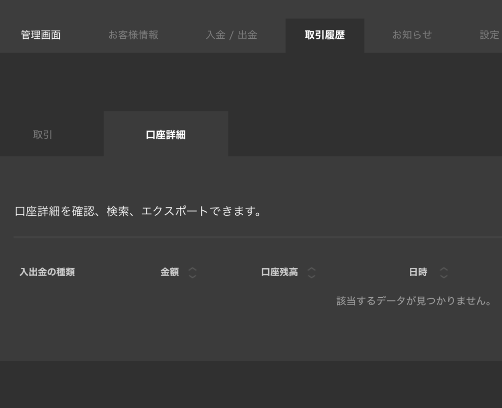 口座詳細をクリックすると、これまでの入金・出金の履歴を確認することができます。