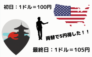 旅行最終日に為替レートが変動し「1ドル=105円」になっていた場合、初日に持っていた1ドルを円に変えたら「5円」得することができます。(手数料等は考慮せず)