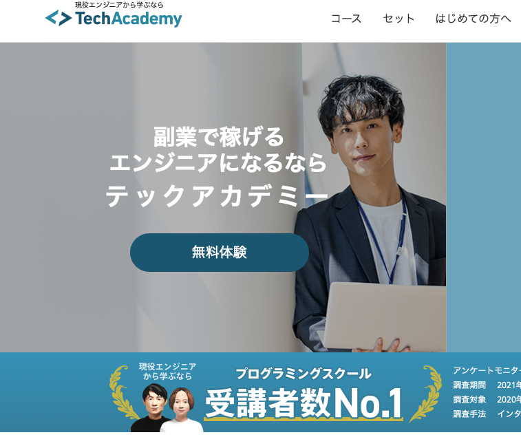 オススメは「TechAcademy(テックアカデミー)」です! 学割を使えば数万円〜10万円程安くなるので、学生のうちに始めるのがチャンスです。