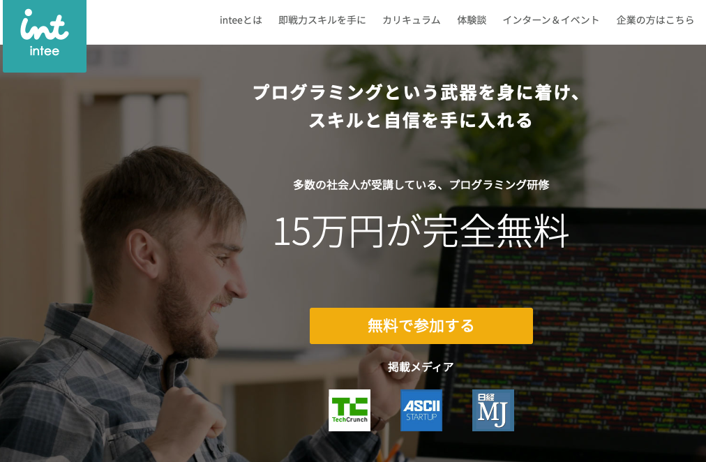 inteeはプログラミング研修を就活生に無料で提供することで優秀な学生を生み出し、「プログラミングのできる学生」と「プログラミングができる人材が欲しい企業」をマッチングする支援サービスです。
